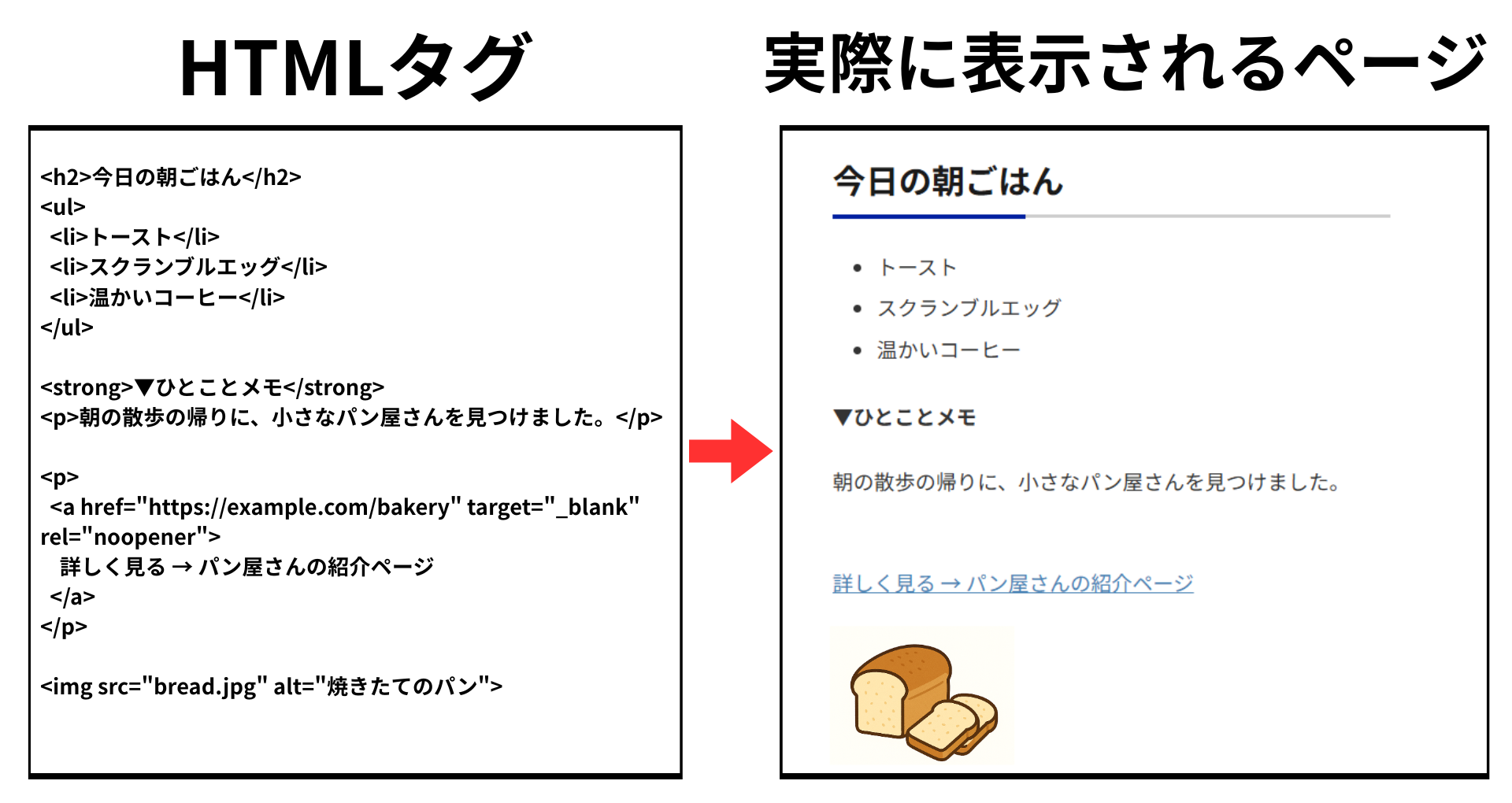 例えば、左のようにHTMLタグを入力すると、実際には右のようにWebページでは表示されます。HTMLタグは、大きく分けて以下の2種類が存在します。