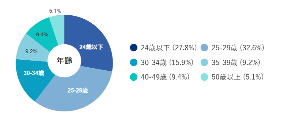 - 年齢分布 : 20代(18人), 30代(9人), 40代(3人)