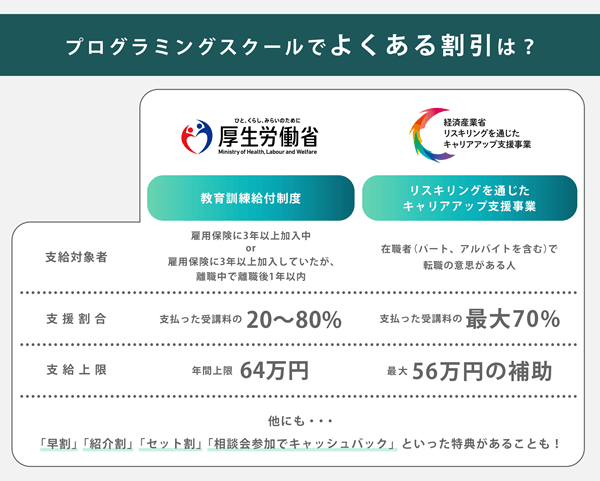 また、いくつかのプログラミングスクールでは、「教育訓練給付金」や「リスキリングを通じたキャリアアップ支援事業」の対象講座があったりします。