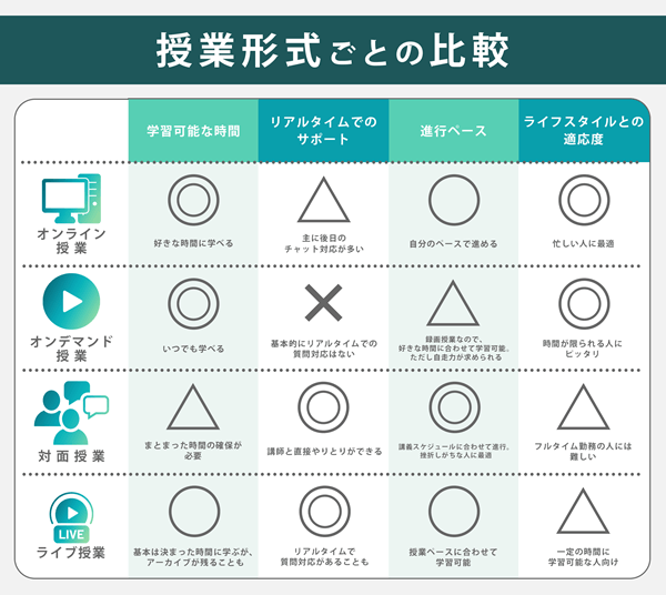 一方で、対面で講師と直接やり取りをしながら学べる「対面授業」や「ライブ授業」を選ぶことで、質問や疑問をその場で解決しやすく、理解度を深めることができます。