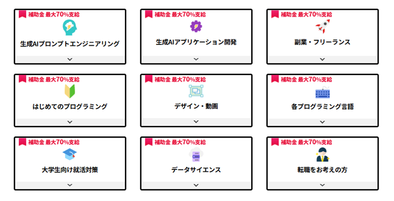ほぼすべてのコースが給付金制度に対応しており、条件を満たせば受講料の最大80%が支給されます。