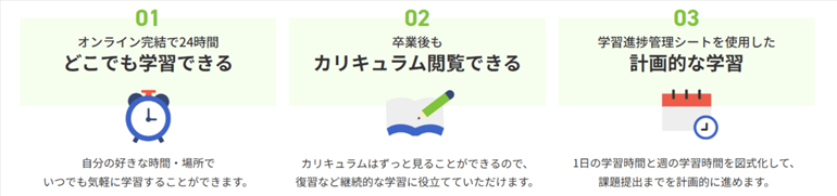 教材はオンライン上で提供され、卒業後も引き続き閲覧が可能なため、復習やスキルアップにも役立つでしょう。