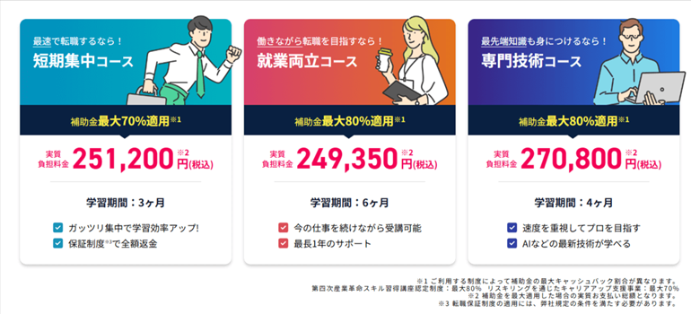 こちらは、ITエンジニアとして本格的にキャリアチェンジしたい方向けのプログラムで、3ヶ月で転職を目指す「短期集中コース」、働きながらじっくり取り組める「就業両立コース」、そして最新技術の習得にも注力した「専門技術コース」の3種類が用意されています。