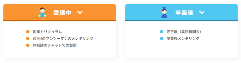 副業を始めたい方向けのサポートとして、「副業カリキュラム」や「卒業後のメンタリング」「寺子屋」といった支援制度も用意されており、受講後も継続的に学びや相談ができるのが特長です。