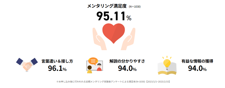 また、受講生からの定期メンタリング満足度は95.11%(2023年1月〜2月調査)と非常に高く、実際に利用した人の多くが「サポートの手厚さ」を高く評価しています。