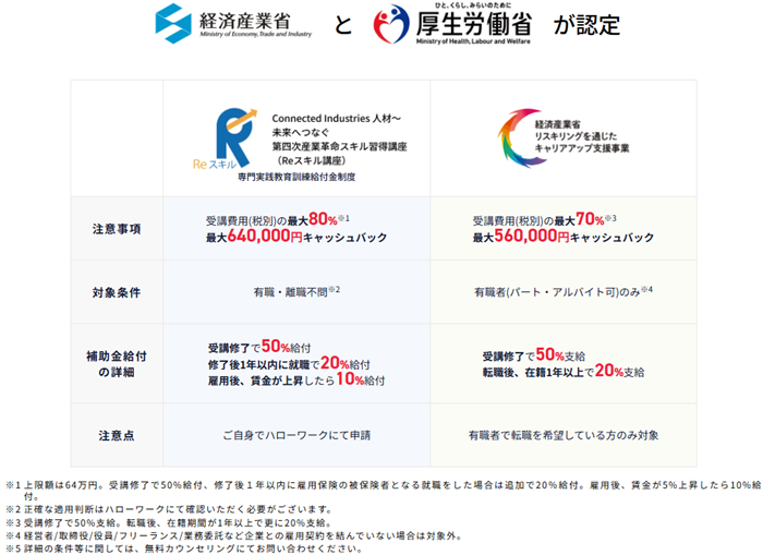 ※補助金の対象には「リスキリングを通じたキャリアアップ支援事業」または「専門実践教育訓練給付金」などの制度が関係します。