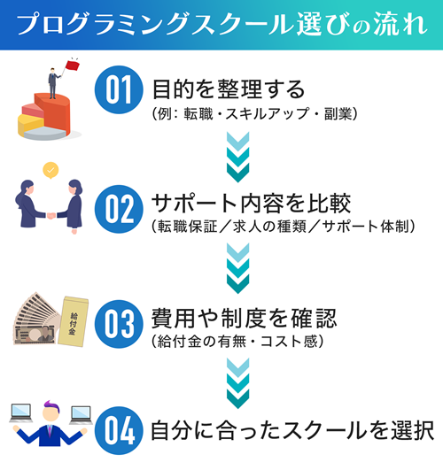 「自分に合った学習スタイル」「受けたい支援内容」「将来目指すキャリア」といった軸を明確にしておくと、スムーズに自分に合うスクールを見つけられますよ。