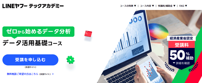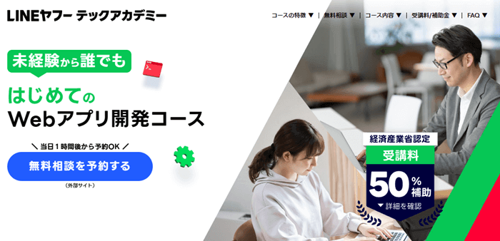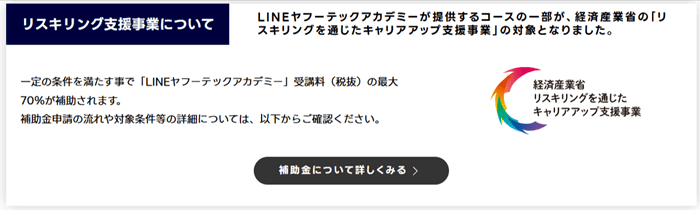 LINEヤフーテックアカデミーも定価は同程度ですが、経済産業省の補助金制度を活用できるコースがあるため、最大70%が還元されます。