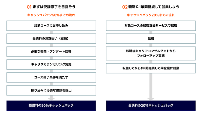 対象コースを修了すると受講料の50%がキャッシュバックされ、さらに転職&1年間の継続勤務で20%還元!