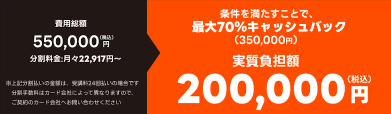 例えば、定価55万円のエンジニア転職保証コースは実質20万円で受講可能です。
