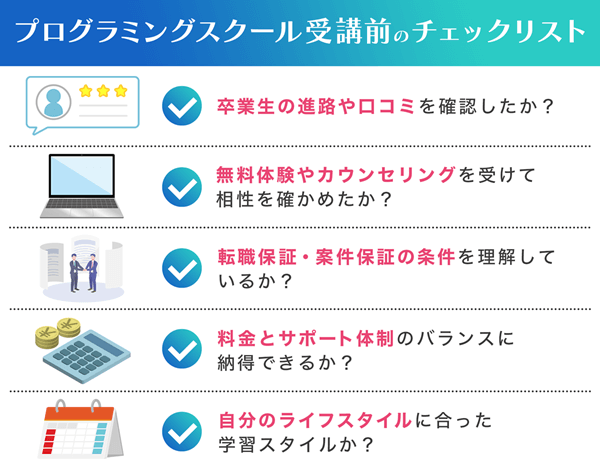 受講前には、卒業生の実績や口コミを調べる、無料体験で相性を確かめる、保証の条件を理解する、料金とサポート体制のバランスを確認するなどの下調べが欠かせません。