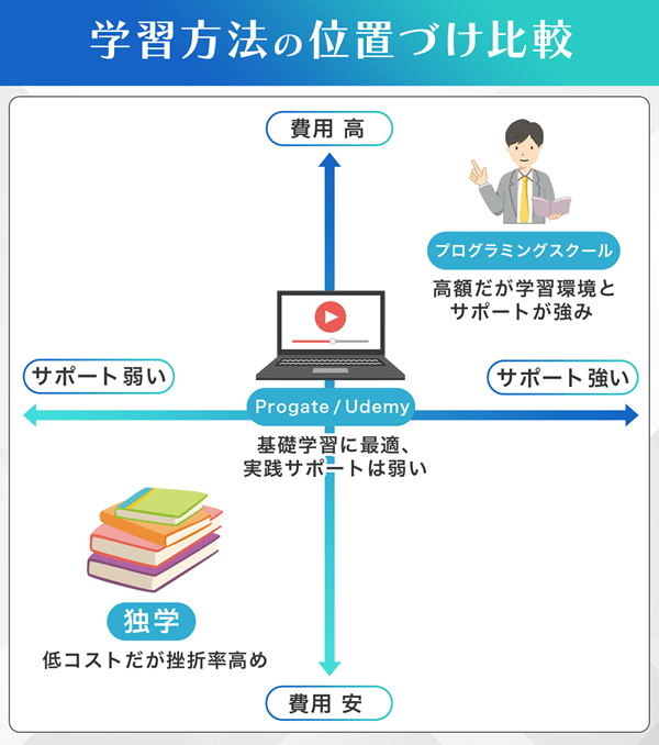 書籍や動画教材を利用して独学で学ぶこともできますし、ProgateやUdemyのようなオンライン学習サービスを活用する人も増えています。