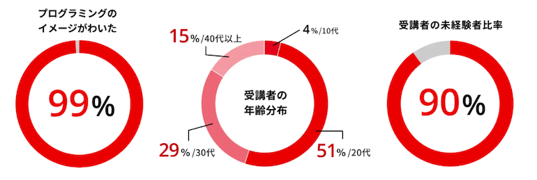 なお、SAMURAI ENGINEERの受講生は、10代から60代以上まで幅広く、そのなかでも20代が半数以上(51%)を占めています。