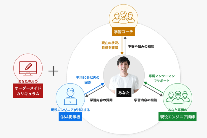 受講中は講師だけでなく、学習コーチとキャリアアドバイザーがサポートに加わります。