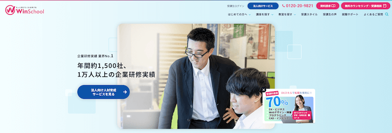 | Winスクール | 複数の転職サービス企業と提携。9割が未経験の中、業界就職率は90%以上を誇る。 |
