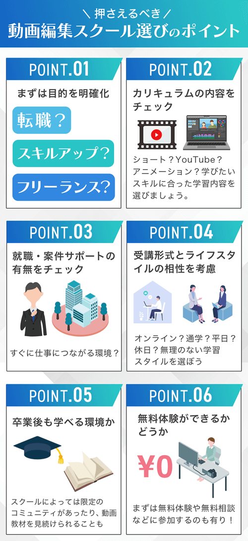 動画編集スキルを効率よく身につけるには、自分に合ったスクール選びが重要です。