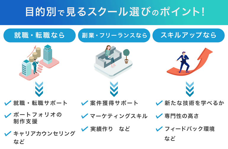 一方で、フリーランスや副業として案件を受けたい人であれば、実務に近い内容の課題に取り組めるスクールや、卒業後に案件紹介をしてくれるスクールが向いているでしょう。