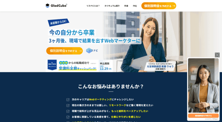 カリキュラムは広告運用・データ分析・SNS運用・SEO・コンテンツ制作まで幅広く、月150本以上の教材と補講・質問対応が充実。