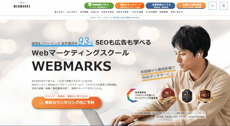 『WEBMARKS(ウェブマークス)』は、SEO対策と広告運用の両方を体系的に学べる、実践重視のWebマーケティングスクールです。
