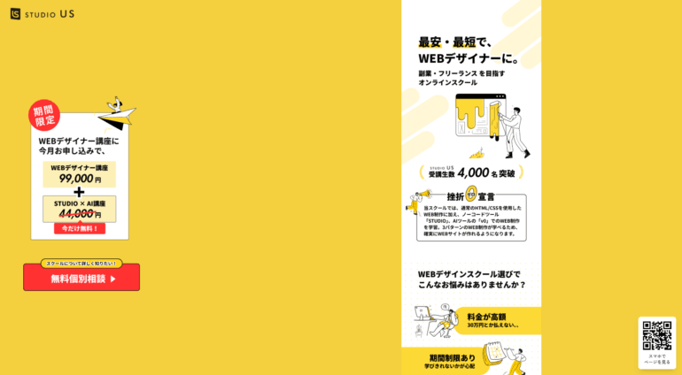 受講生の93%がフリーランスや副業案件を獲得している実績もあり、学習後のキャリア支援が手厚いのも魅力。リスキリング補助金の対象講座であるため、該当すれば大幅に受講費を抑えることも可能です。
