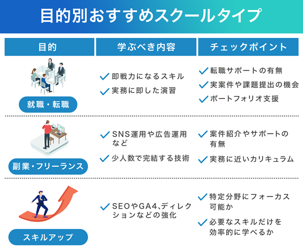 そこで注目されているのが、専門スキルを効率よく学べる「Webマーケティングスクール」です。