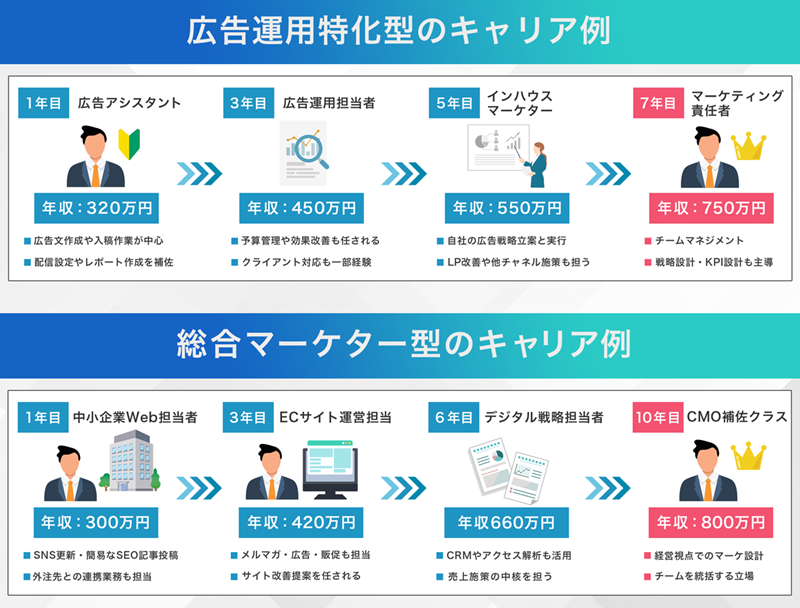 実務経験や分析スキル、広告運用力、チームマネジメントなどを積むほど、収入の伸びが期待できるでしょう。