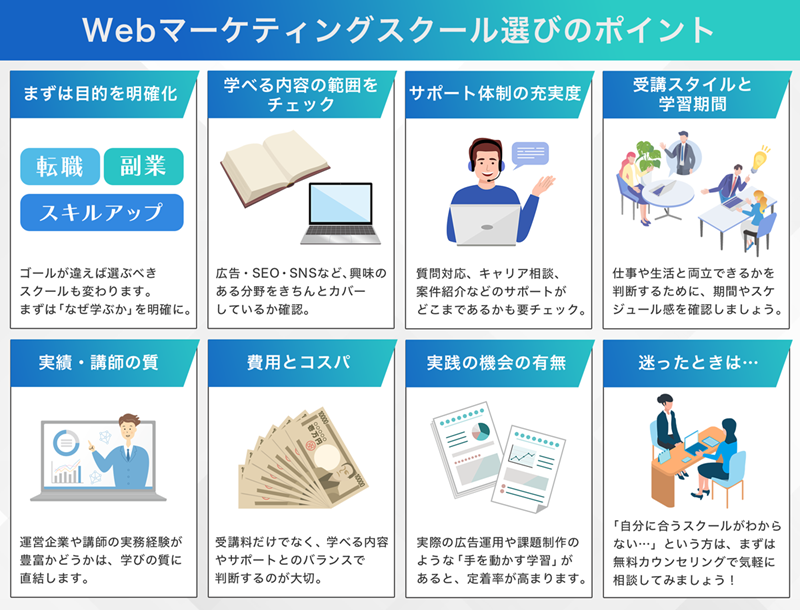 「Webマーケティングを学びたいけど、どのスクールが自分に合っているのか分からない…」