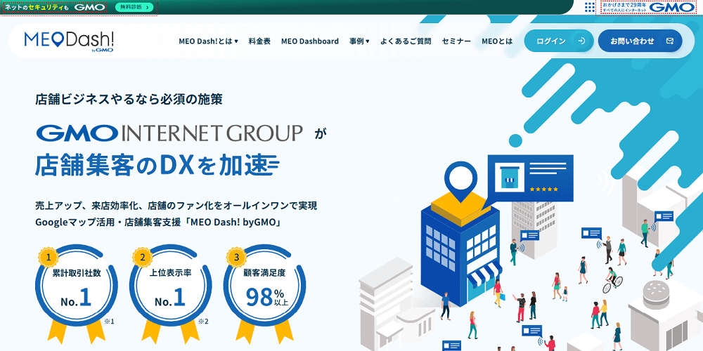 GMO TECH株式会社は、MEO市場で多くの実績を持っているサービス「MEO Dash! byGMO」を提供している会社です。このサービスは、2023年9月には「累計取引社数NO.1」「上位表示率No.1」を獲得していると公式サイトで公表しています。