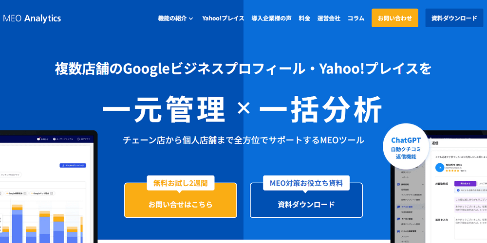 MEO事業に関しては、取引企業の実績は3,000社以上とされています。ビジネスプロフィールとYahoo!プレイスの運用が便利に行えるシステムを提供し、しっかりと数値を管理して施策をサポートしている企業です。