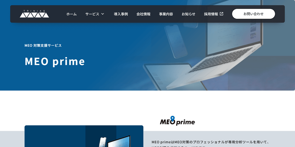 MEO事業では、他社よりストリートビュー、口コミ、ホームページなどを活用した施策に強みを持っています。これまでの導入企業において、90%が上位表示を達成していると実績をアピールしている企業です。