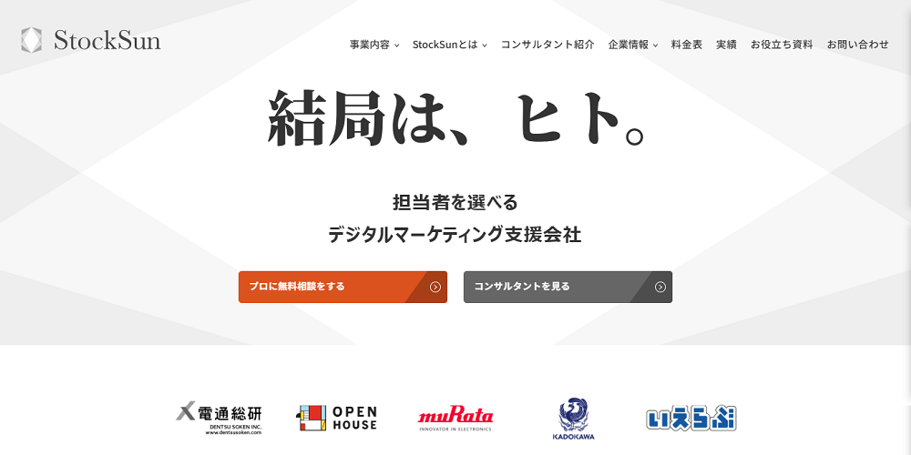 StockSun株式会社は、さまざまな大手IT企業と取引実績があり、サイト制作支援やWeb広告運用支援などを行っている会社です。また、業界別のマーケティングにも力を入れています。